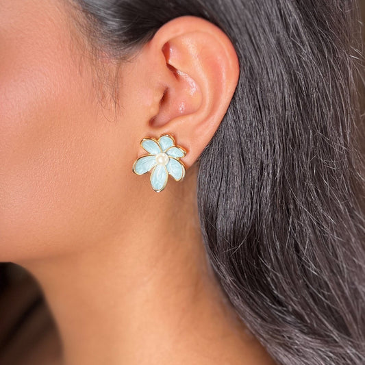 Pearl Hearted Flower Studs (Blue)- 18k Gold Plated